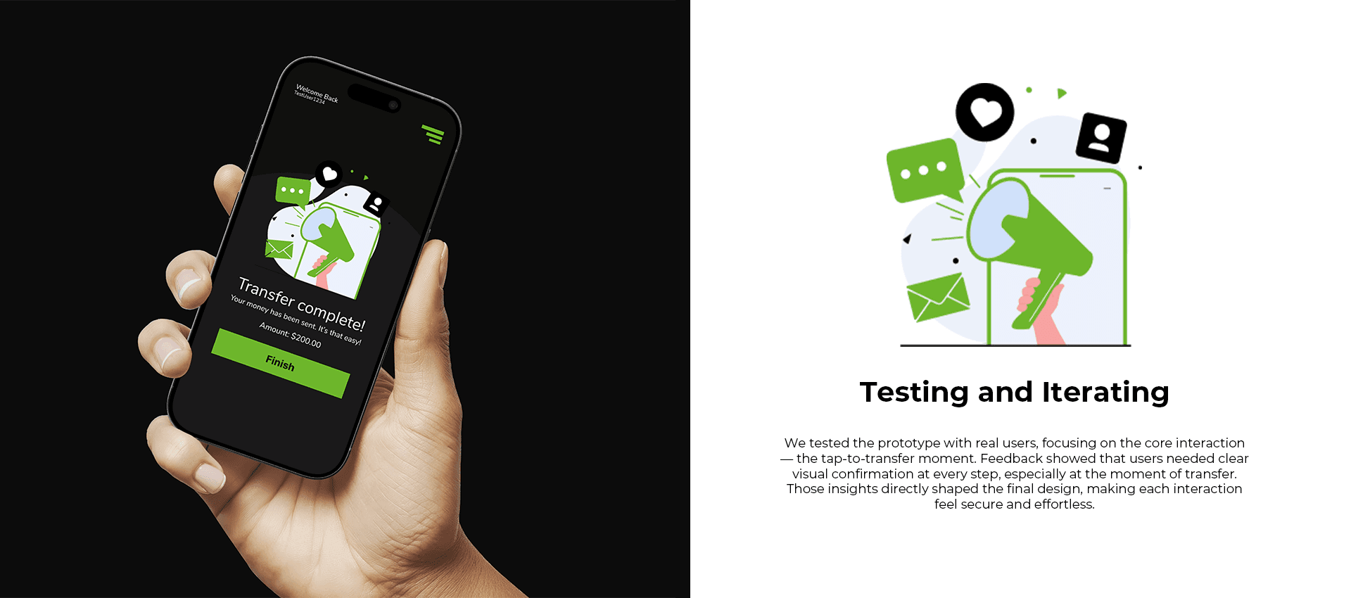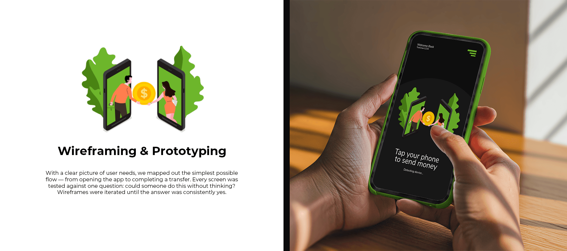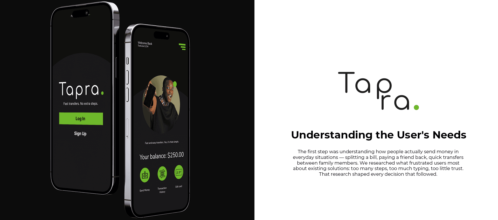 Tapra solves this by turning your phone into the transfer. Bring two devices together, tap, and the money moves — instantly. The entire UX was designed around one goal: make it so simple that anyone can do it on the first try.